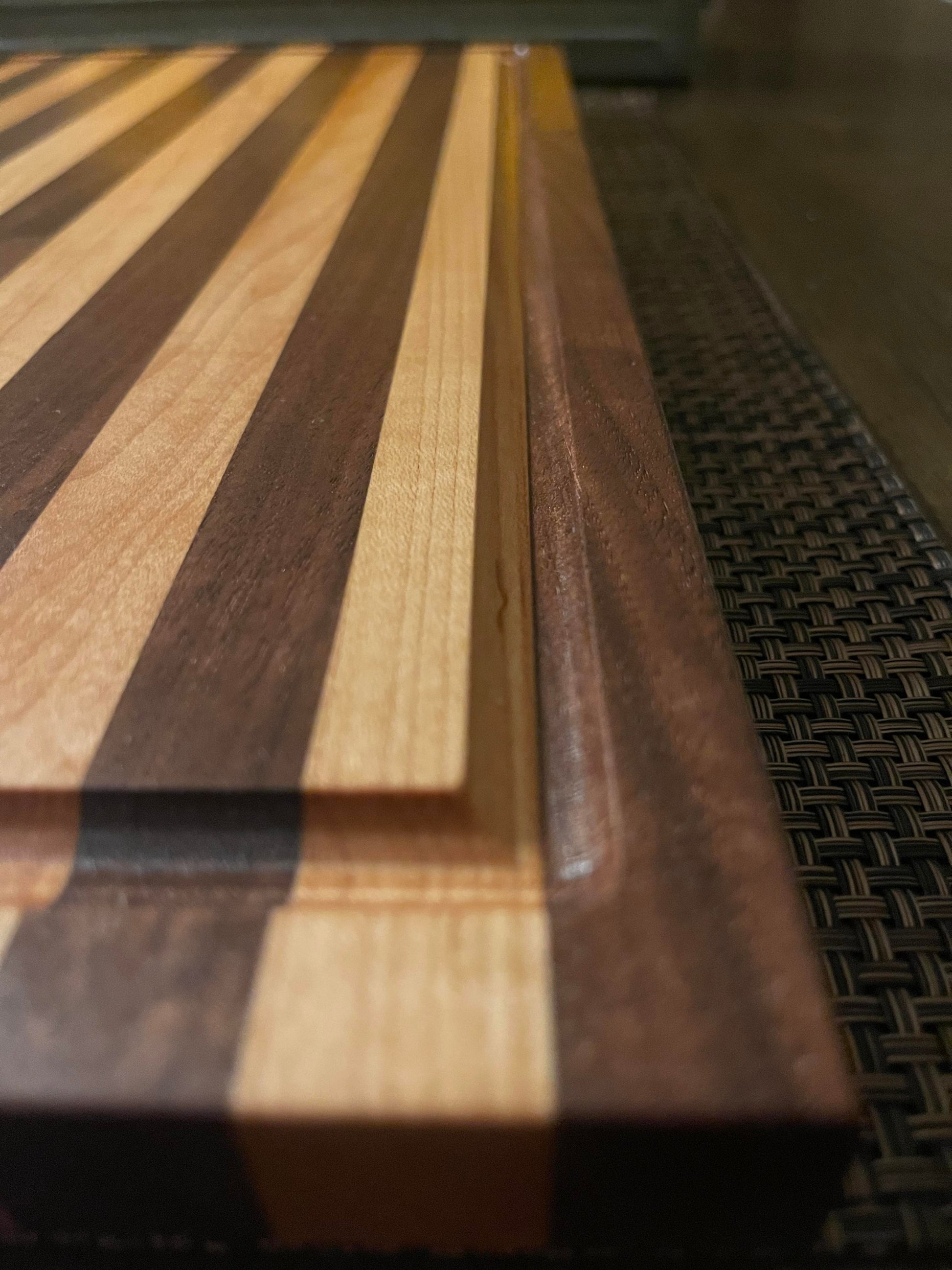 18 1/2" x 9 3/4" x 1" American Flag cutting board made from hard maple and walnut wood. The stars are laser engraved and it is finished with food grade mineral oil and cutting board wax. This large cutting board is more patriotic than John Cena acting like a Marine! Give that beef you're slinging a salute with this cutting board. For custom engraving, add what you would like in the special instructions at checkout.